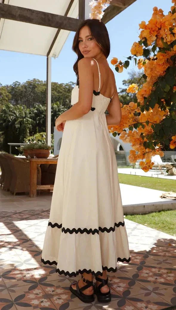Embrace elegance with our Amillia maxi dress, featuring delicate ric rac trim and slender, adjustable straps for a perfect fit. An invisible back zip ensures a seamless look, complemented by a shirred back panel for added comfort. Flaunt your impeccable taste and embrace your femininity with this stunning wardrobe essential.