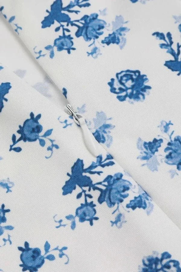 Evoke the endless summer. The Dahlia Gown isn't just a dress; it's a feeling—a sun-drenched afternoon on the Amalfi Coast, the gentle clinking of glasses at a garden wedding, a stolen romantic moment under the stars. The silhouette is designed to celebrate your form, cascading down to a subtle mermaid hem that whispers with every step you take. Its delicate porcelain-blue floral print is a timeless ode to femininity, set against a crisp white canvas. This is the dress you'll reach for when you want to feel effortlessly captivating and create memories you'll cherish forever.